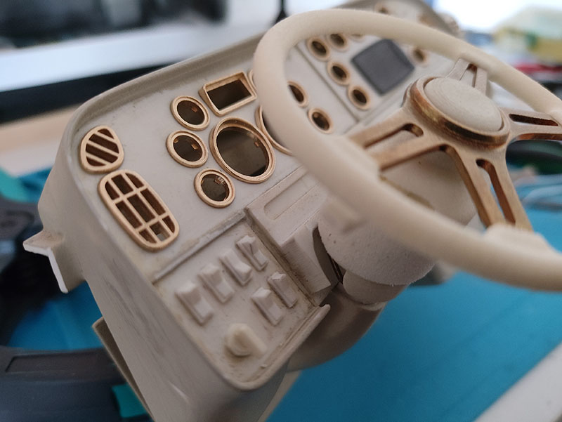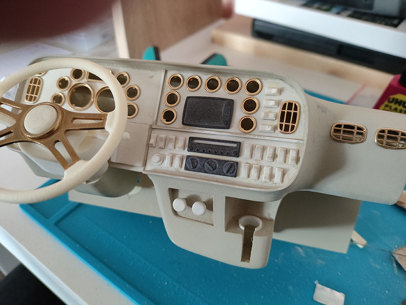 Weiter geht's: Hab das Armaturenbrett nun auch eine Frischzellenkur verpasst. Die etwas zu dicken Kunststoffringe der Instrumente wurde in Messing 3D-gedruckt. Das ermöglichte mir diese um einiges filigraner darzustellen.